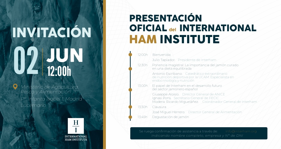 El próximo 2 de junio tendrá lugar en la sede del Ministerio de Agricultura, Pesca y Alimentación el acto de presentación oficial del International Ham Institute (Interham), una entidad concebida para reforzar la posición del jamón como producto estratégico del sector agroalimentario español y promover su proyección internacional.